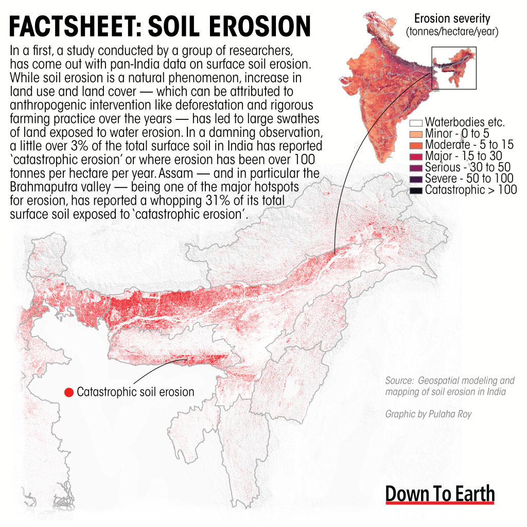 - Approximately 5% of India''s geographical area falls into the catastrophic erosion category, threatening infrastructure like roads and buildings with deep gullies, especially in parts of Assam, Meghalaya, and Himachal Pradesh.