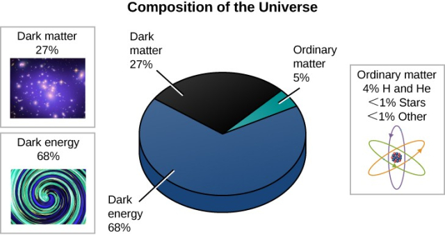 - Composition of the Universe: Dark energy accounts for roughly 68 percent of the universe’s total mass and energy. Dark matter makes up 27 percent.