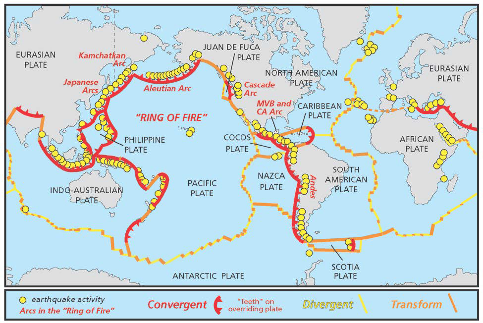 - This ring extends along the Andes mountains of South America to Alaska and from the Aleutian Islands to Japan, Philippines, Indonesia to New Zealand.