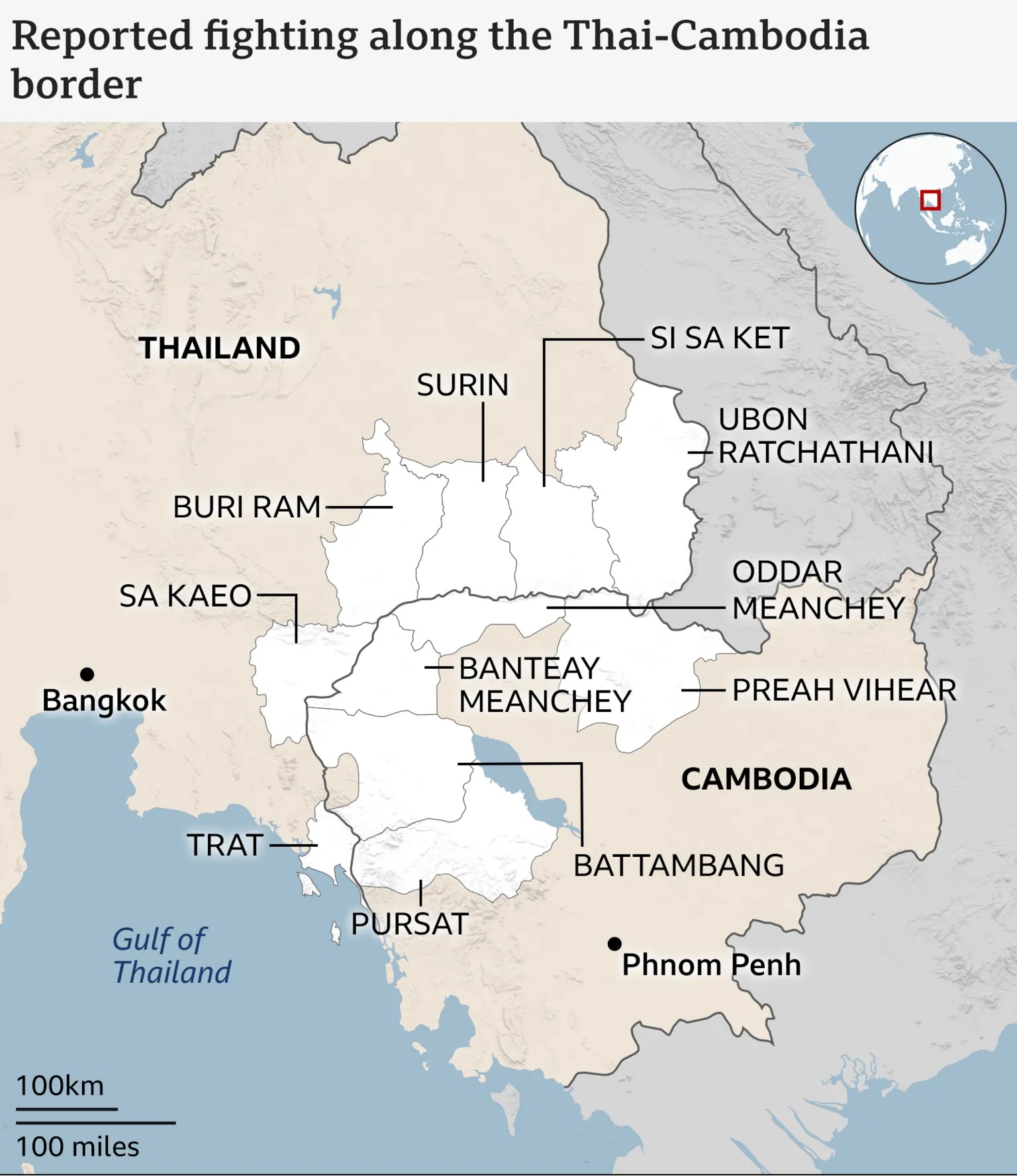 - Renewed fighting has erupted along the Thailand–Cambodia border, with artillery, rockets, drones and airstrikes used by both sides, causing rising civilian and military casualties.