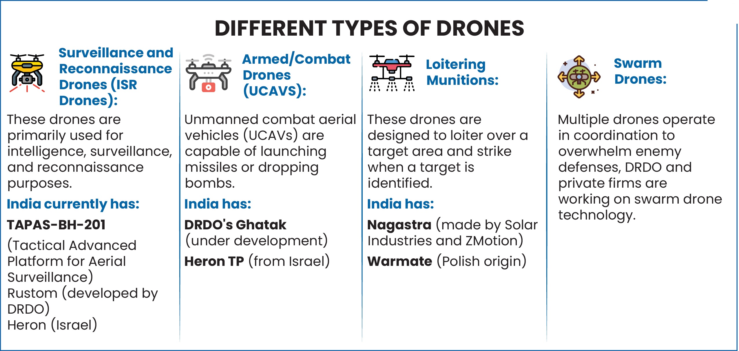 - Defence Applications: Drones enable border surveillance, intelligence gathering and precision strikes; integrated with radar and air-defence networks, they enhance rapid threat detection and protection of critical infrastructure (e.g., Operation Sindoor).