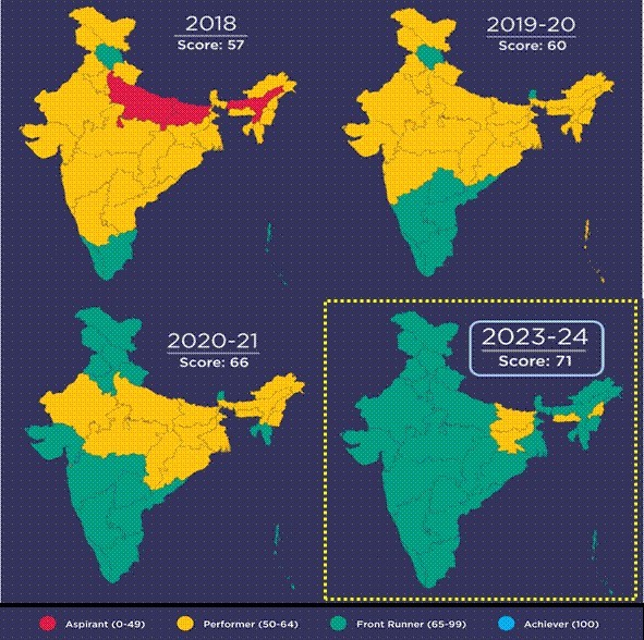 - The composite score for India improved from 57 in 2018 to 66 in 2020-21 to further to 71 in 2023-24.