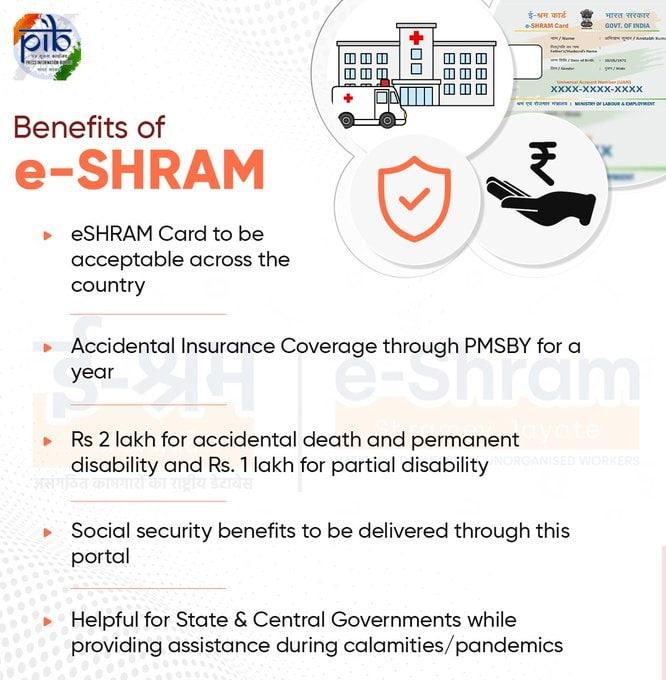 - Aadhar based authentication is used to ensure no duplication. After registration, an eShram card is issued having a unique Universal Account Number (UAN).