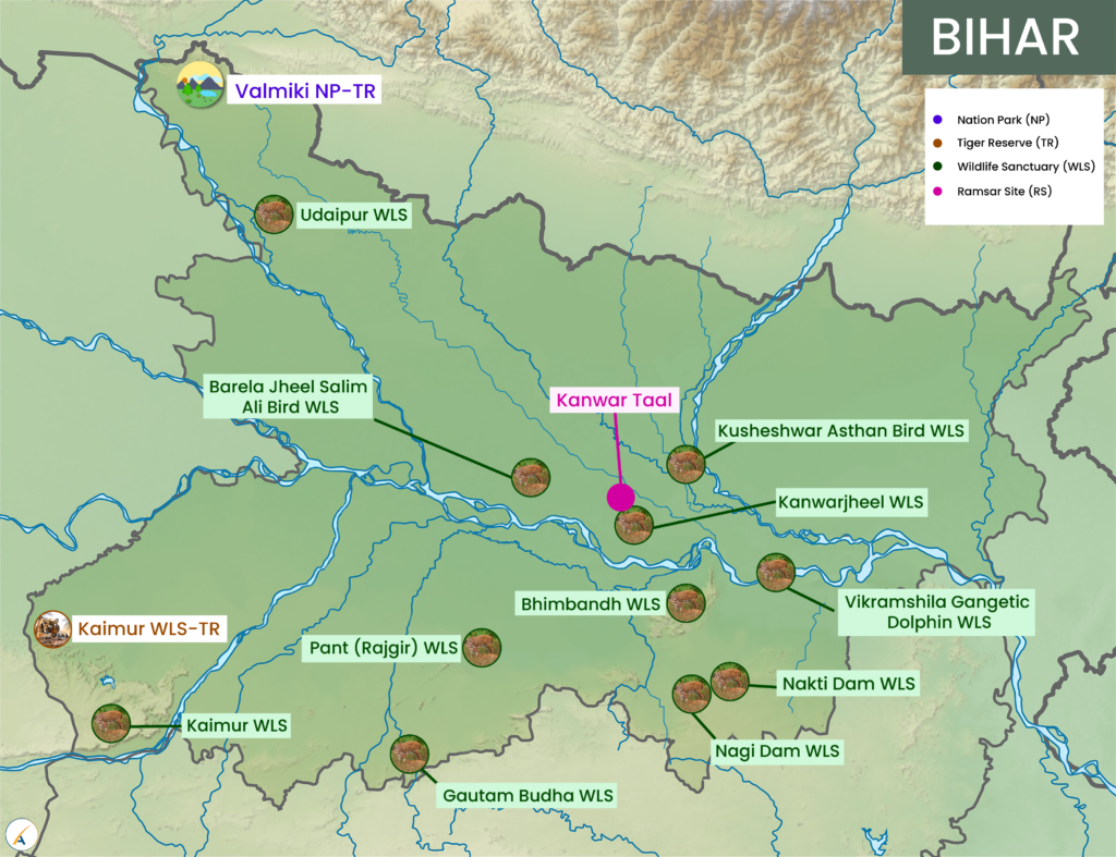 - Kanwar Lake in Begusarai district was designated Bihar’s first Ramsar Site in 2020.