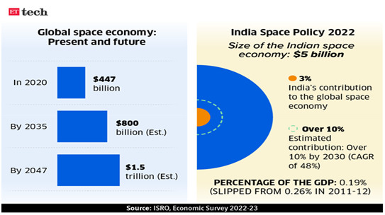 - Share in Global Space Economy: At current, the space sector in India accounts for around two percent of the global space economy.