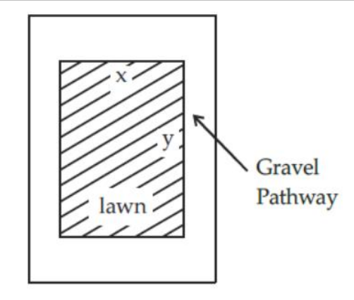 A rectangular plot of lawn shown in the figure has dimensions x and y and is surrounded by a gravel pathway of width 2 m. What is the total area of the pathway?